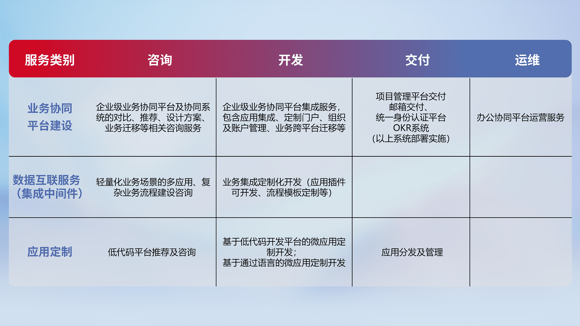 针对钉钉、、、企微、、、IDaas等平台级产品提供产品的规划、、、方案、、、、交付、、、定制化开发等服务,,,实现如统一协同办公、、智能客户服务、、、、混合会议管理、、、、智能数据查询、、、等业务场景,,实现数字化转型。。